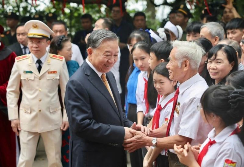 Tổng Bí thư, Chủ tịch nước Tô Lâm thăm hỏi người già, trẻ nhỏ tại Đền Hùng. Ảnh: Giang Huy