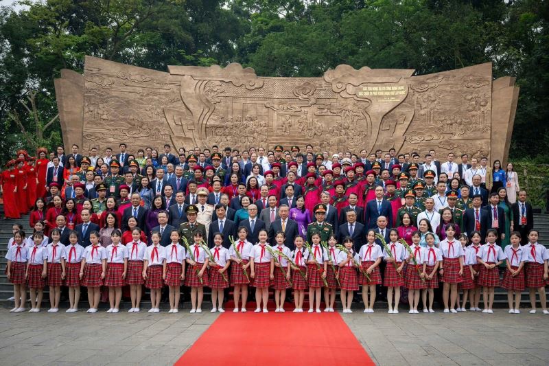 Tổng Bí thư, Chủ tịch nước Tô Lâm cùng lãnh đạo Đảng, Nhà nước lên núi Nghĩa Lĩnh dâng hương tưởng niệm các vua Hùng, sáng 26/4. Ảnh: Giang Huy