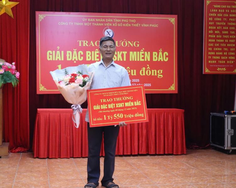 Trong đợt phát hành vé XSKT miền Bắc trên địa bàn Vĩnh Phúc ngày 09/12/2025, bộ vé giải đặc biệt XSKT miền Bắc bao gồm 20 vé đã ra thưởng tại Vĩnh Phúc, số trúng thưởng: 72908, ký hiệu: Từ 1SU đến 20SU. Đã có 1 khách hàng may mắn trúng thưởng 5 vé, là ông: Nguyễn Văn Hiếu, trú tại phường Vĩnh Yên, trong đó có 3 vé giải Đặc biệt và 2 vé giải phụ giải đặ biệt với tổng giá trị giải thưởng 1 tỷ 550 triệu đồng.
